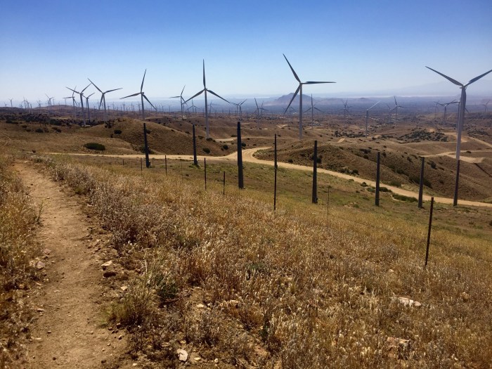 Dalton dropped us at Willow Springs Road (where I’d hitched into town from the previous day). Butterfly and I set off for the next road crossing at Highway 58 and Dalton said he would pick us up there in a few hours. With little more than 2L of water, our packs were ridiculously light and we made great time. The air was cool, and for once the wind was behaving. We hiked together and talked for the entire 8 mile wind farm traverse. Butterfly was not only great company but also an electrical engineer. What he didn’t know about wind farms would fit comfortably on the back of a postage stamp. Before I knew it the Highway appeared below us and the 8 miles was done. We reached the overpass and, with precision of a Swiss timepiece, Dalton was there to collect us.