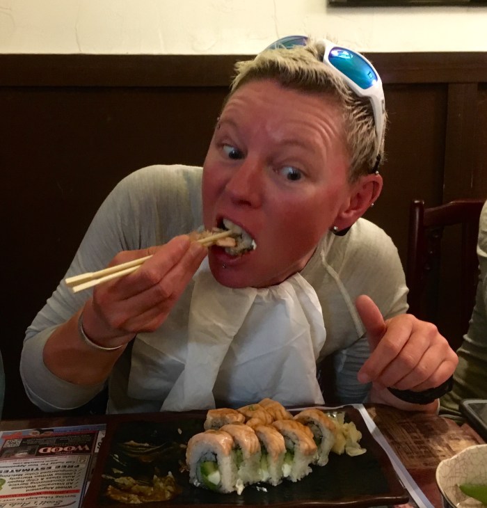 Back at the BW the Colorado Hiker Flash were in something of a clusterfuck with their resupply strategy for the Sierras. There was much talk of snow shoes and ice axes and to be honest, it was making me feel a little squirrely. What we needed was a good sushi feast … and so it came to pass that I spent the rest of the evening shoving raw fish in my pie hole and trying to blow my face off with the wasabi.
