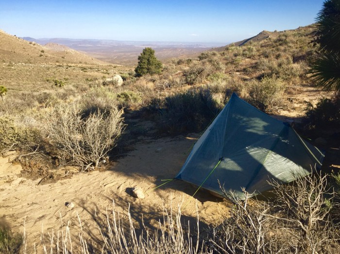 Not even a soft sand climb at the end of the day could dampen my spirits. As I made the final descent down to Bird Spring Pass the wind started doing that desert thing again. By the time I reached camp it was blowing itself to bits. A handful of hikers were clinging to tiny sheltered pitches. I pitched behind a sizable Joshua Tree that offered at least some protection from the gale and the most amazing views across the valley below.
