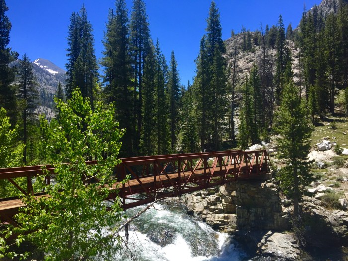 The infamous Evolution Creek!First challenge of the day (apart from opening the silly bear thing) was crossing the creek next to camp. There was a skinny looking log but it was icy! It took me an eternity to teeter across the thing and my legs were all wobbly when I finally reached the other side. I concluded that it was far too early in the morning for this shit! We hiked on. I’d only just recovered from the first one, when another one honed into view … this was a good five foot above a raging torrent, at least it was a bit wider. Nevertheless, another 10 mins had to be invested in cohercing my trembling legs across the precarious log!An impromptu bath!Ironically, these little streams were the least of my concerns, up ahead was Evolution Creek … one of the most notorious creek crossings on the trail … Oh deep, profound joy! Thankfully, because the thing can get so out of hand, the nice wilderness people had provided us with an alternative … wading through waist high, not quite so mental or likely to kill you, but still a freezing cold creek water! We opted for the not quite so mental option. Actually it wasn’t too bad, just deep and cold and we all agreed that it wasn’t anywhere near as badas the trail rumour mill reported. Collectively we had wasted a lot of energy worrying about something that never existed … sounds familiar !!Finally someone has tge good sense to build a bridge!We dried off over lunch and I massaged my wet and wrinkled little trotter. The ball of my right foot had been aching ever since the ridiculous snow fields of Muir Pass. I hoped it was a nothing thing that would just go away on its own. I was keen to get on so I punched out the next 7 miles ahead of the others. It was a spectacular hike, all the time running alongside the mighty San Joaquin River. Thankfully, some bright spark had eventually decided that a bridge might be a good idea. At last! … I was most grateful!The ever changing trail!The very highest partS of the Sierras are now behind me and already the terrain and topography are beginning to change. It’s wonderful to spend more time back in the tree line and away from snow generally … I, like just about everyone else on the trail, was officially totally over the snow! We stopped at the Muir Ranch junction to take on more food before the final uphill battle of the day … a 4 mile, 2,000ft slog up sun baked rubble switchbacks. I plugged in and marched up. It was hot, hard going and not what I would recommend at the end of an already long day!4 miles and 2,000ft of sun baked rubble switchbacksAs is so often the case, the trail rewards your efforts. Camp offered the most amazing views … Spreadsheet and I haggled over the best spot. Dinner was a real scrape around the Bear Can. Supplies are running very low. We need to reach VVR tomorrow and it is still a pass and a full days hike away. I had now been totally disconnected from civilization for a whole week. It was a somewhat surreal experience, so too was catching a whiff of myself. I couldn’t believe how bad I smelt. The Funk was well and truly upon me and I really wasn’t keen on it. The PCT had yet to cure my obsession with personal hygiene!Sunset from camp!I sat there in my own funk, watching the sun set with a cup of hot powdered milk and a Snickers bar … This is the life I thought to myself!