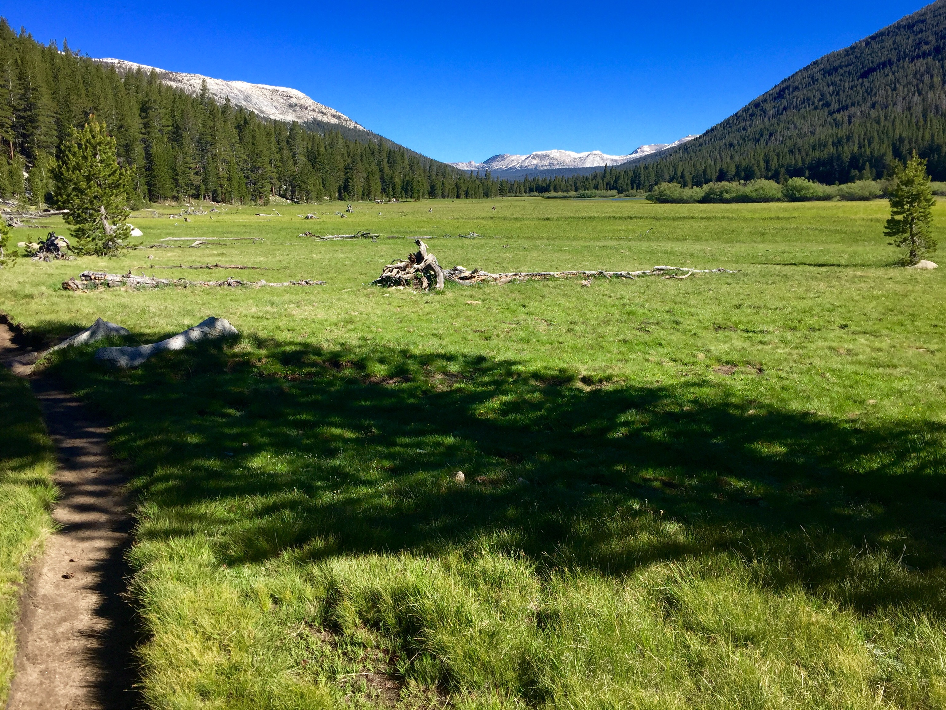 I was chuffed with myself for managing to get out of my tent marginally earlier than the previous few days. However, I still needed to do much better if I wanted to reach Canada anytime soon. As I ate my breakfast and drank my coffee, I watched the sun slowly creep along the meadow. Deer grazed idly nearby. I was feeling torn by the trail. So often I want to simply chill out,take my time and really enjoy these moments and the amazing scenery. However, the trail requires that you keep moving. To make it all the way to Canada before the weather window closes I have to keep up an average of more than 20 miles a day. The tough and slow conditions in the High Sierras have already put me behind schedule, but now that I’ve reached Yosemite I should be able to pick up the pace and get back on track … The question is do I want to?
