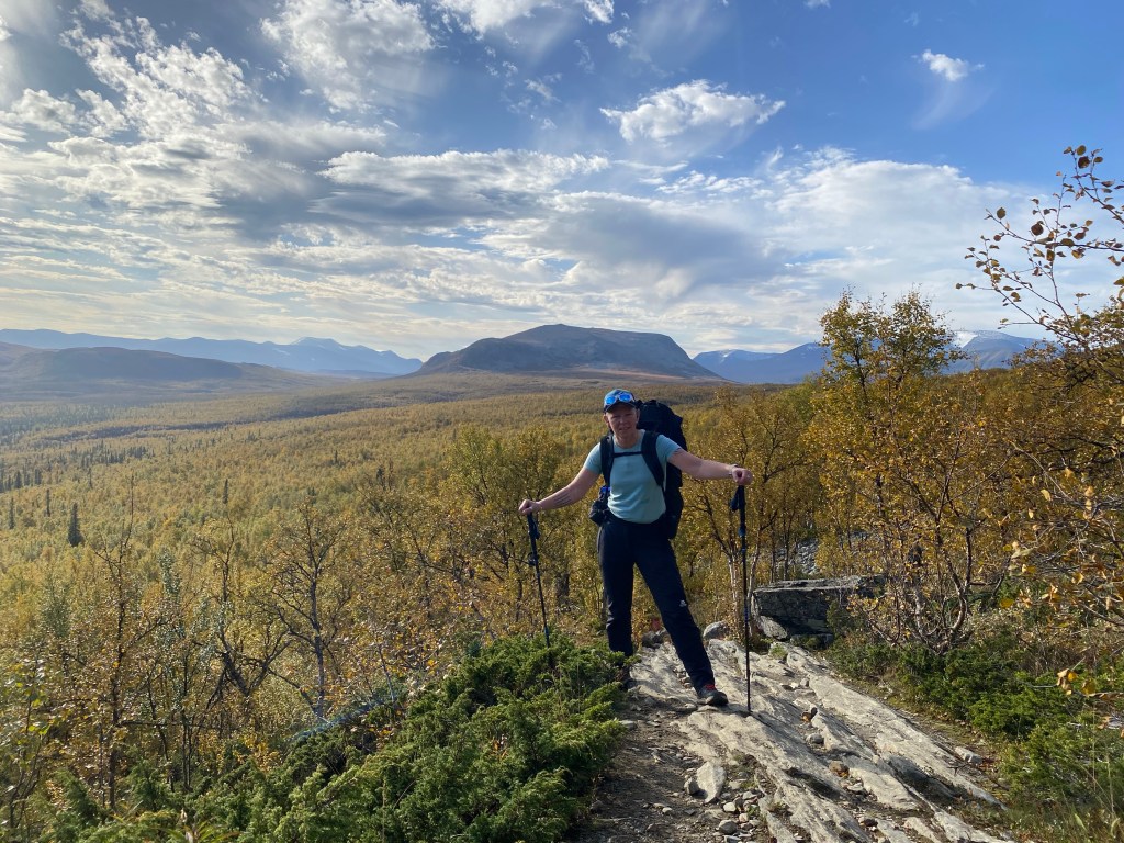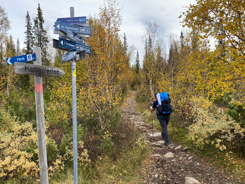 The going was easy on good a good surface, with a gentle elevation. We were hiking through dense alpine birch forests and the autumn colours were a gorgeous kaleidoscope of golden yellow, orange and red. Thrilled to be on the trail at last, we walked with a spring in our step and made excellent progress. In no time at all we had passed all of the hikers that had arrived on the Bussgods with us.